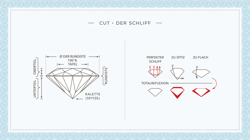 在图中,左侧标有红色的区域展现了切割比例差的钻石与切割比例好、亮度高的钻石之间的区别。要获得切割质量完美、内部全反射的钻石,就必须去除这部分区域。