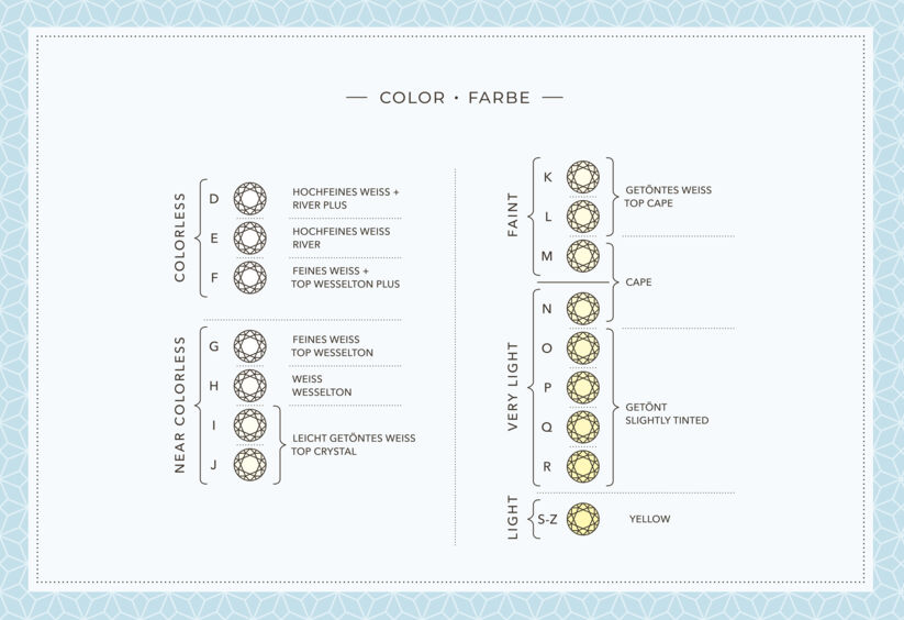 钻石的颜色受大自然的影响。根据定义,钻石是碳的立方变体,其完美形态是绝对无色的。这种钻石极为罕见,证书等级为 D。它们可以呈现彩虹的所有颜色,其价值随着颜色强度的增加而增加。